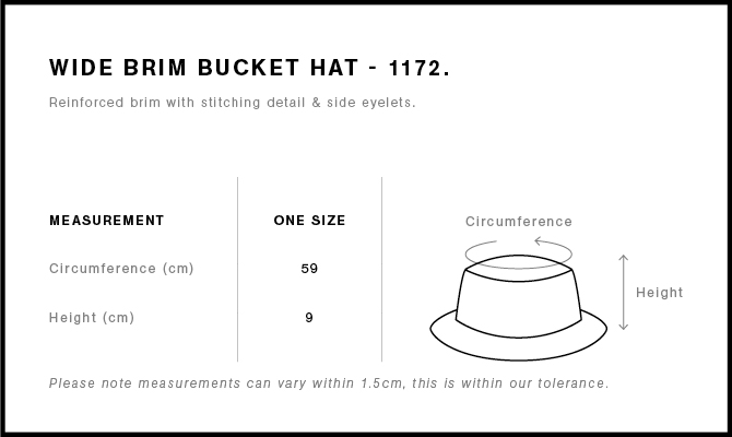 Construction : Reinforced large brim with stitching detail, side eyelets, self-fabric chin strap, plastic adjustable toggle